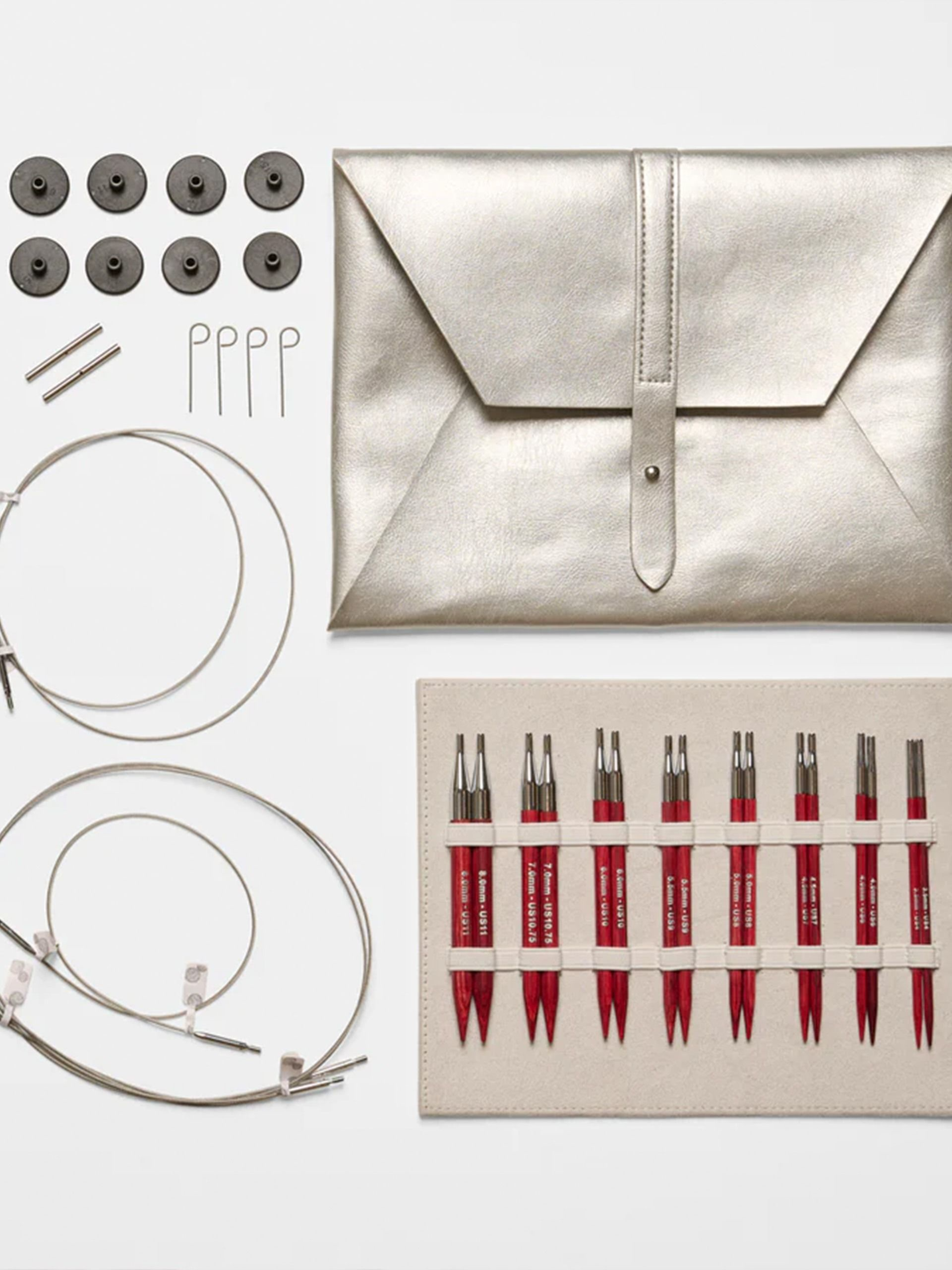 Fordelen ved udskiftelige rundpinde er, at du nemt og enkelt kan skifte både pindstørrelse og wirelængden. Du har derfor ikke behov for at have flere forskellige rundpinde på lager, da du med dette sæt hurtigt kan lave netop dén rundpind, som dit strikkeprojekt kræver.